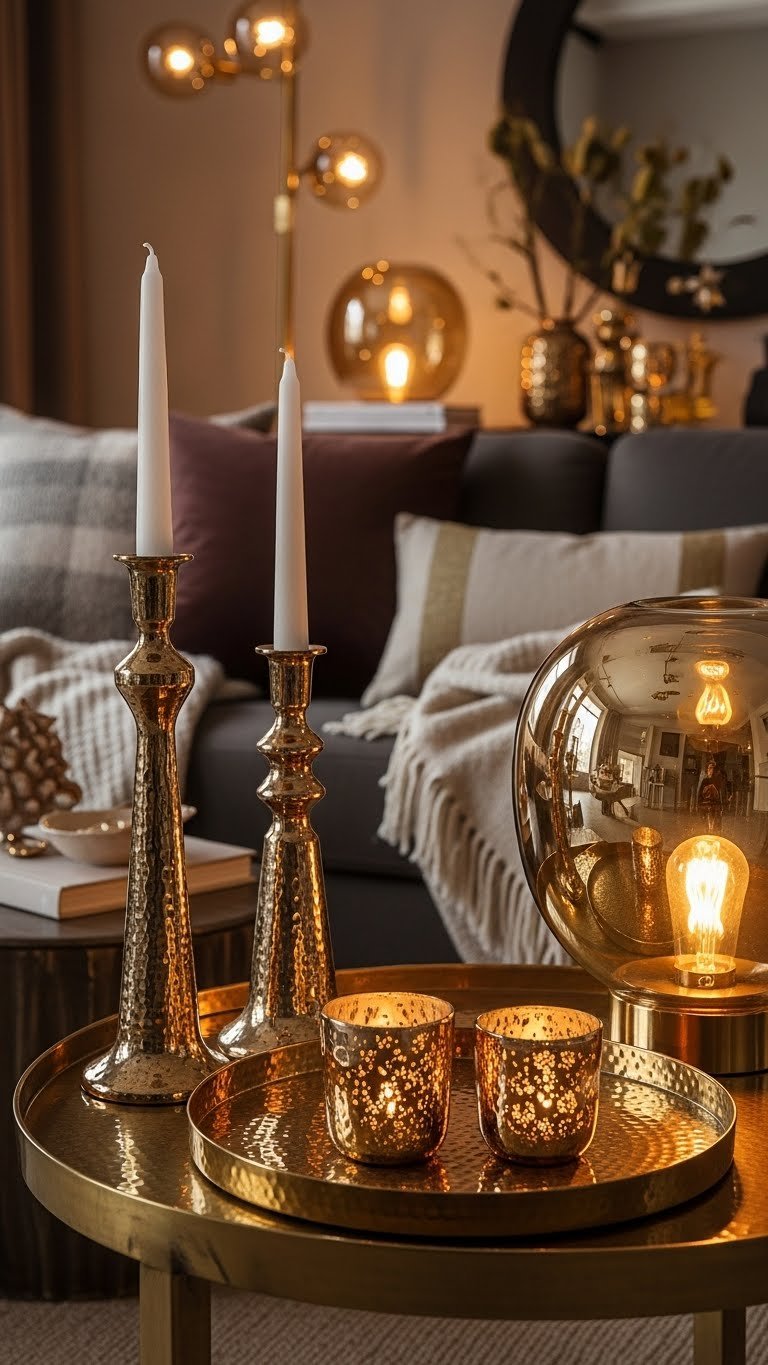 Brighten your winter scheme with warm metallics and brass accents that catch low light and reflect cozy glow across the room. Layer aged brass fixtures with soft textiles so you can bask in subtle warmth. Choose hammered metals for tactile interest—candlesticks, trays, lamp bases—that patina gracefully.