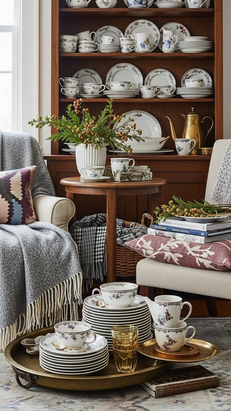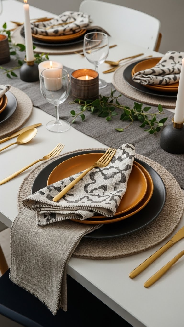 Bring in tableware and textiles that taste like the season—think matte stoneware in deep ochres, linen napkins with stitched edges, and brass flatware that warms up candlelit dinners. You’ll mix festive flatware with textured chargers, fold patterned napkins casually, and layer wool placemats for warmth.