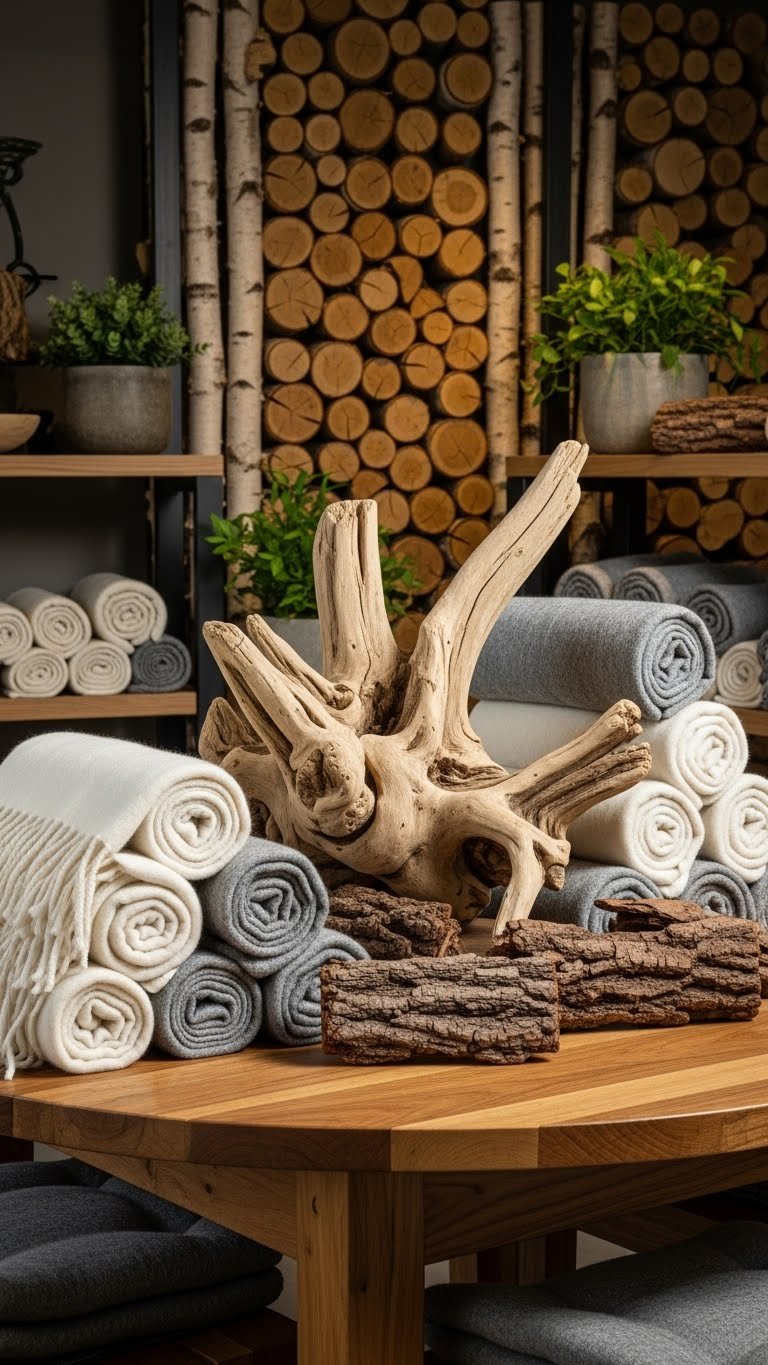 Bringing your greenery indoors sets the stage for layering natural materials and wood accents that amplify winter’s warmth. You’ll mix textures—cozy wool, rough bark, smooth driftwood—so a driftwood centerpiece anchors a table while a birch stack display adds sculptural glow.