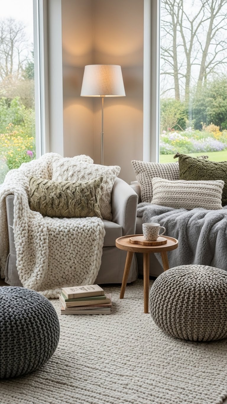 You’ll add hearth seating, a slim side table for tea, knitted poufs for flexible seating, warm light, and a view that invites lingering.
