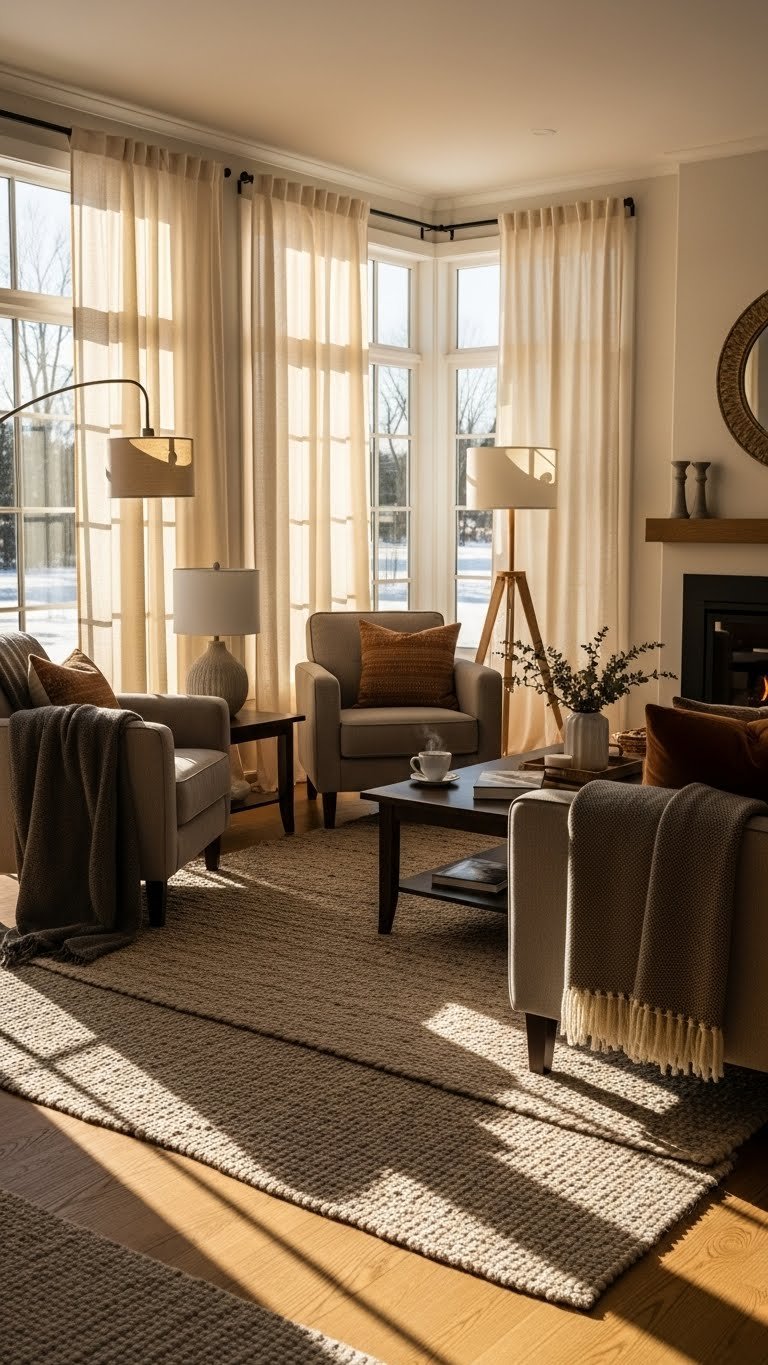 Often you’ll find the chill clinging to exterior walls, so pull sofas and chairs a few inches inward to keep toes and textiles warm. Move sofas away from cold surfaces, angle seating toward sunlight, and layer rugs for grounded warmth.
