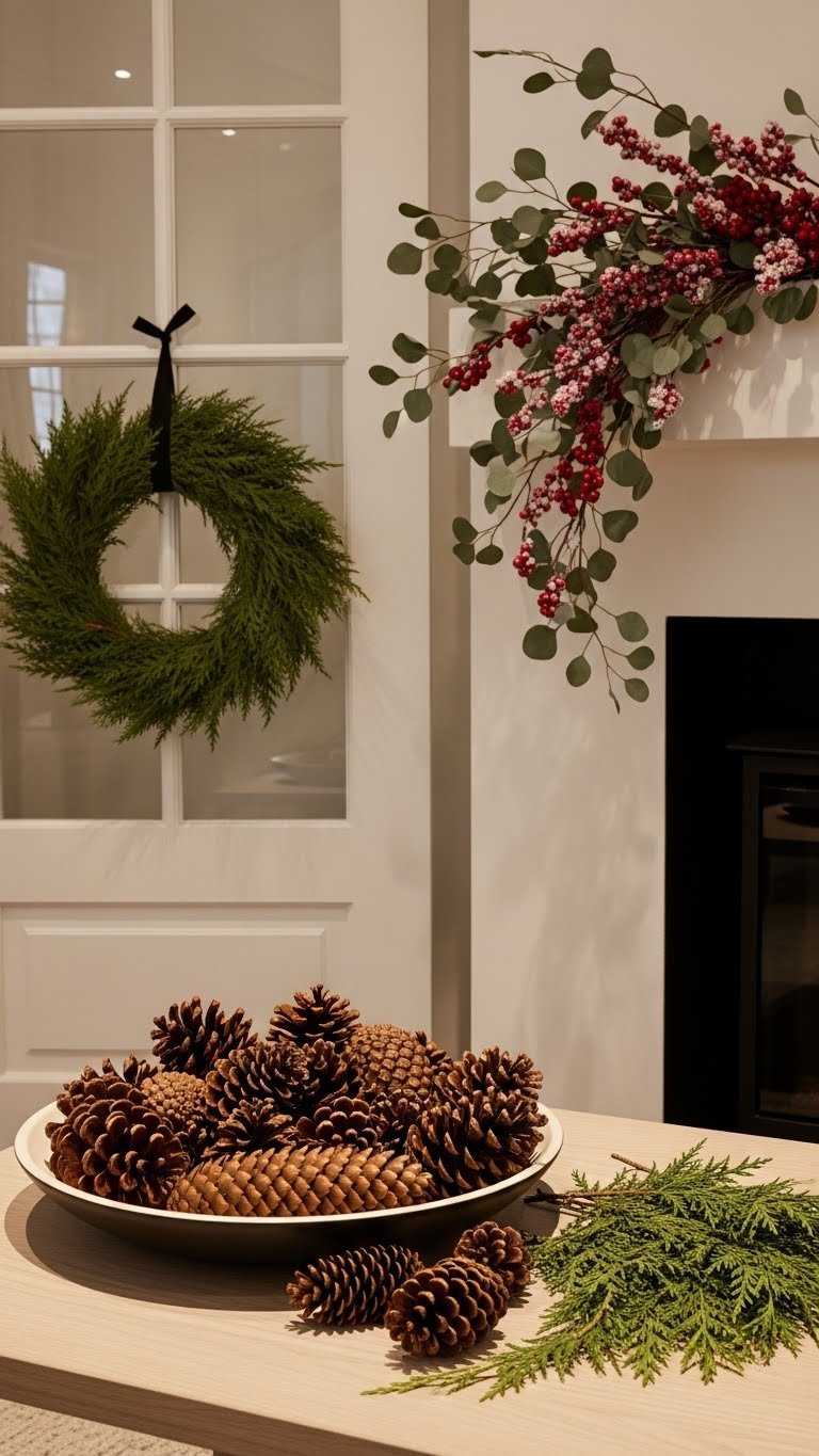 Lean into easy, evergreen displays that look intentional without demanding daily care: group a few varnished or natural pinecones in a shallow bowl, hang a minimal wreath of preserved cedar on the door, or nestle a cluster of faux berries and muted eucalyptus on a mantel.
