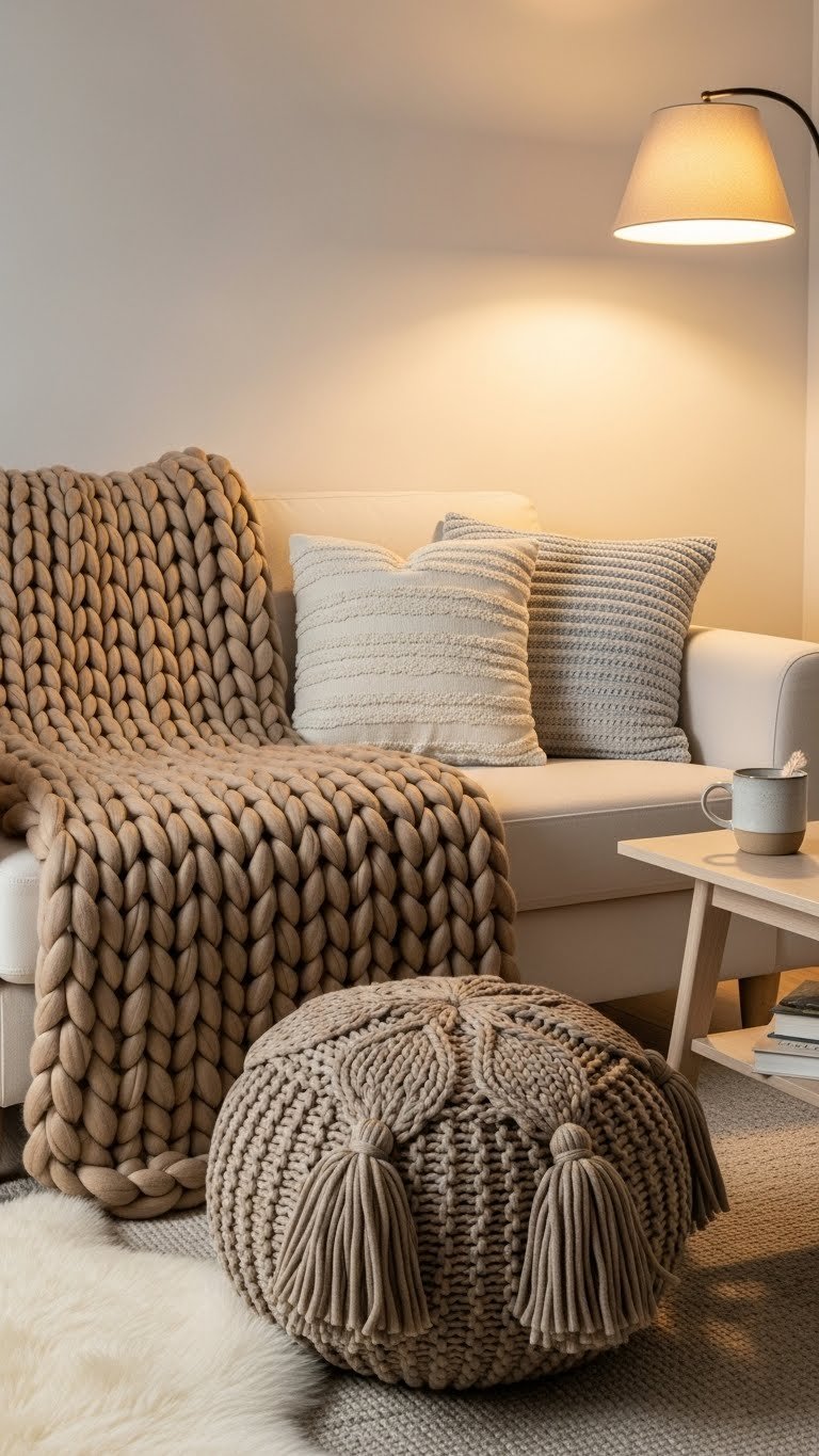 Drape a chunky knit throw across your sofa or at the foot of your bed to add immediate texture and cozy warmth; the oversized stitches create visual weight and trap heat efficiently.