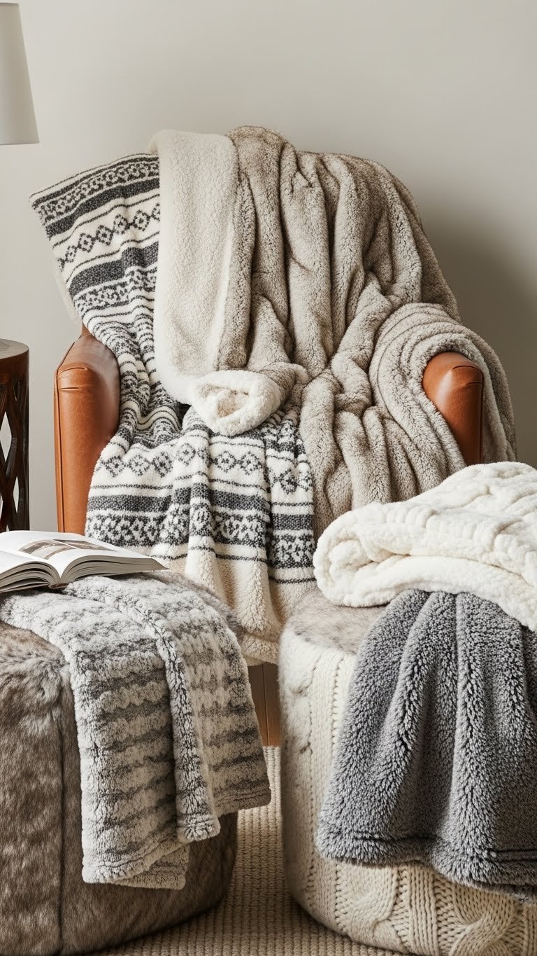 If you’ve layered chunky knits, bring in faux fur to add a softer, plush dimension that contrasts those bold stitches. Drape a faux-fur blanket over a leather chair, pair with a patterned sherpa throw for visual rhythm, and tuck another on faux fur ottomans to invite lounging. You’ll create tactile contrast, cozy freedom, and a curated, effortless winter look that feels lived-in.