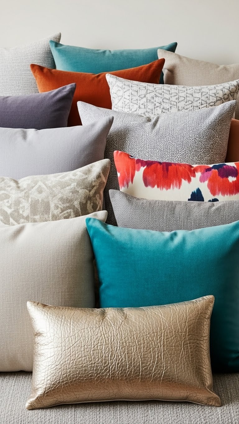 Start with larger anchors, add mid-sized color pops, then finish with a textured or metallic accent. Your pillow layering will feel curated, relaxed and freeform without looking fussy.