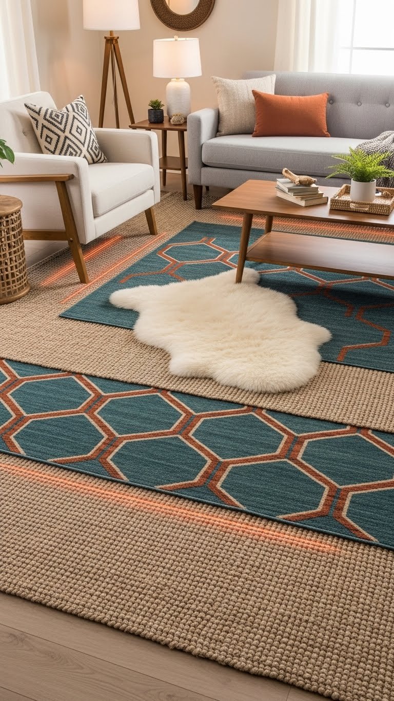 Bring rooms together and trap warmth underfoot by adding area rugs to define and insulate key zones. You’ll layer textures and patterns for effortless pattern layering, pairing a bold rug with neutral pieces. Tuck discreet heating mats beneath low-pile options to boost warmth.