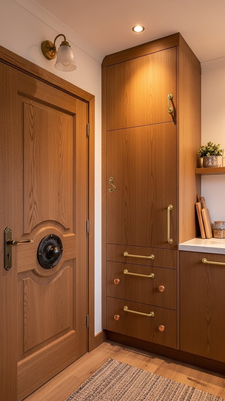 Pairing warm woods with metallic hardware instantly lifts a room’s polish without stealing its cozy feel. You’ll swap bland knobs for brass, bronze, or copper polished fixtures to add warmth and character. Choose matte or burnished finishes and mix modern levers with vintage pulls for a relaxed, curated look.