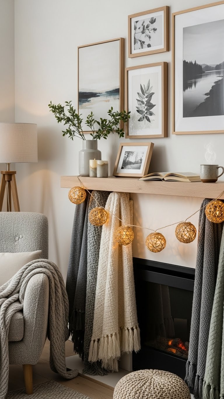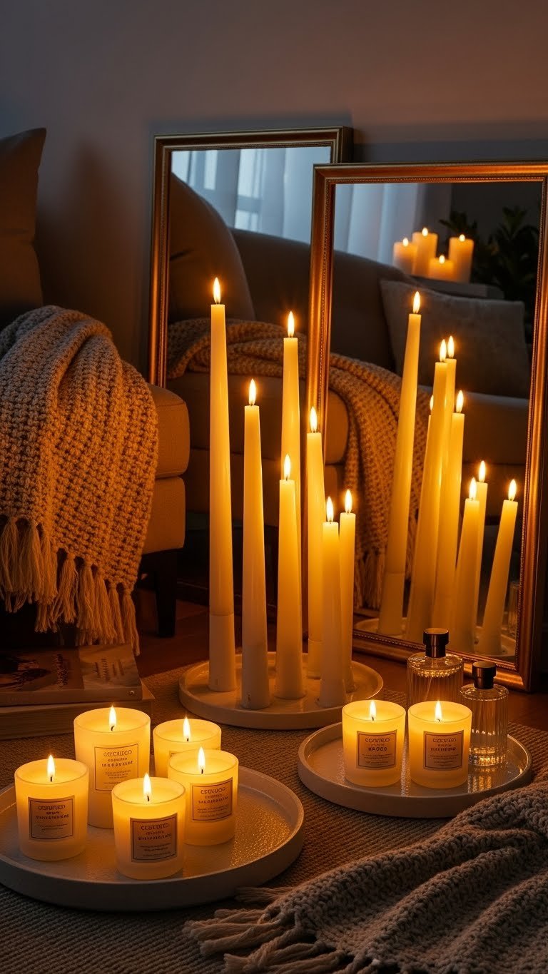 Bring in candles and battery-operated flame lights to layer in instant warmth and motion without the risk of open flames. You’ll mix scented votives on trays, cluster flameless tapers in varying heights, and place them near mirrors or textured throws to amplify glow.