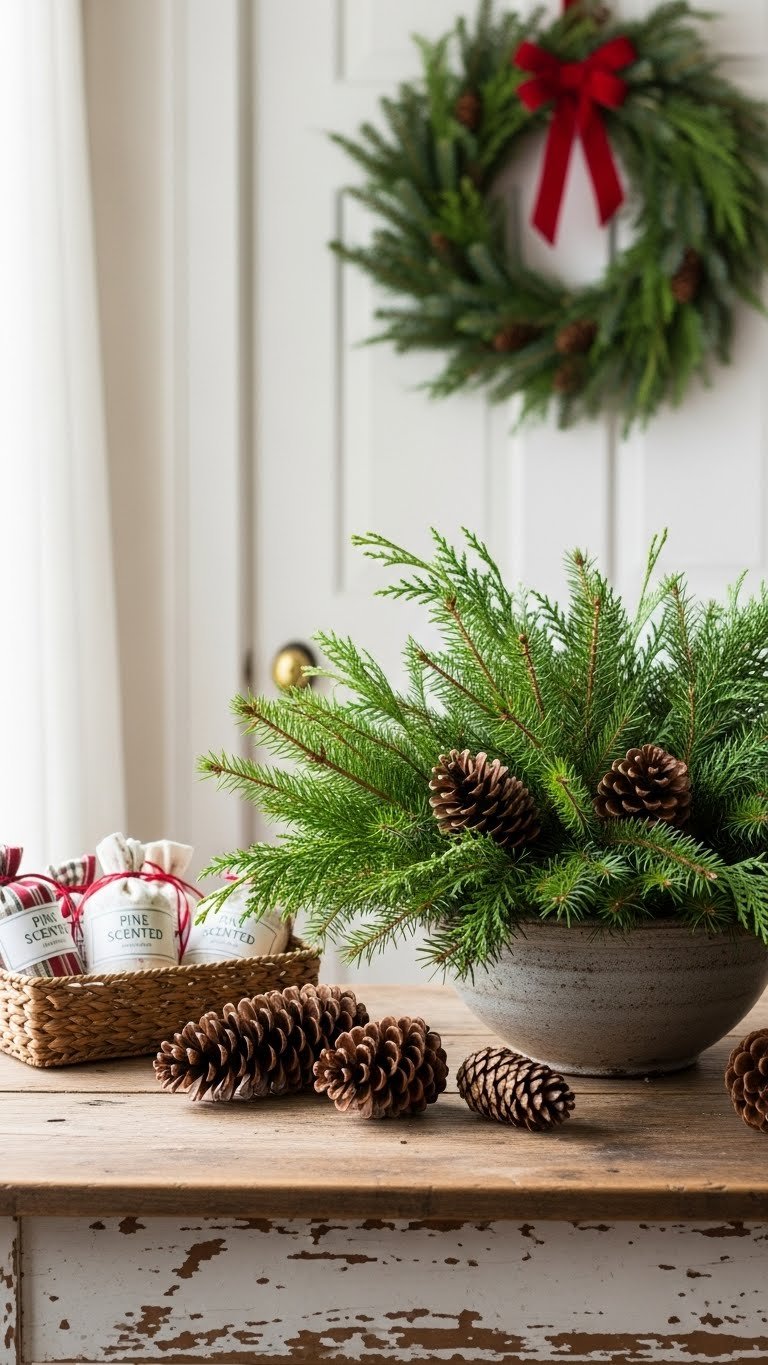 Arrange clippings in low bowls, scatter pinecones along runners, or craft simple winter wreaths for doors and windows. Add pine scented sachets to drawers or baskets for layered aroma. Keep compositions airy and unfussy to celebrate nature’s quiet elegance.