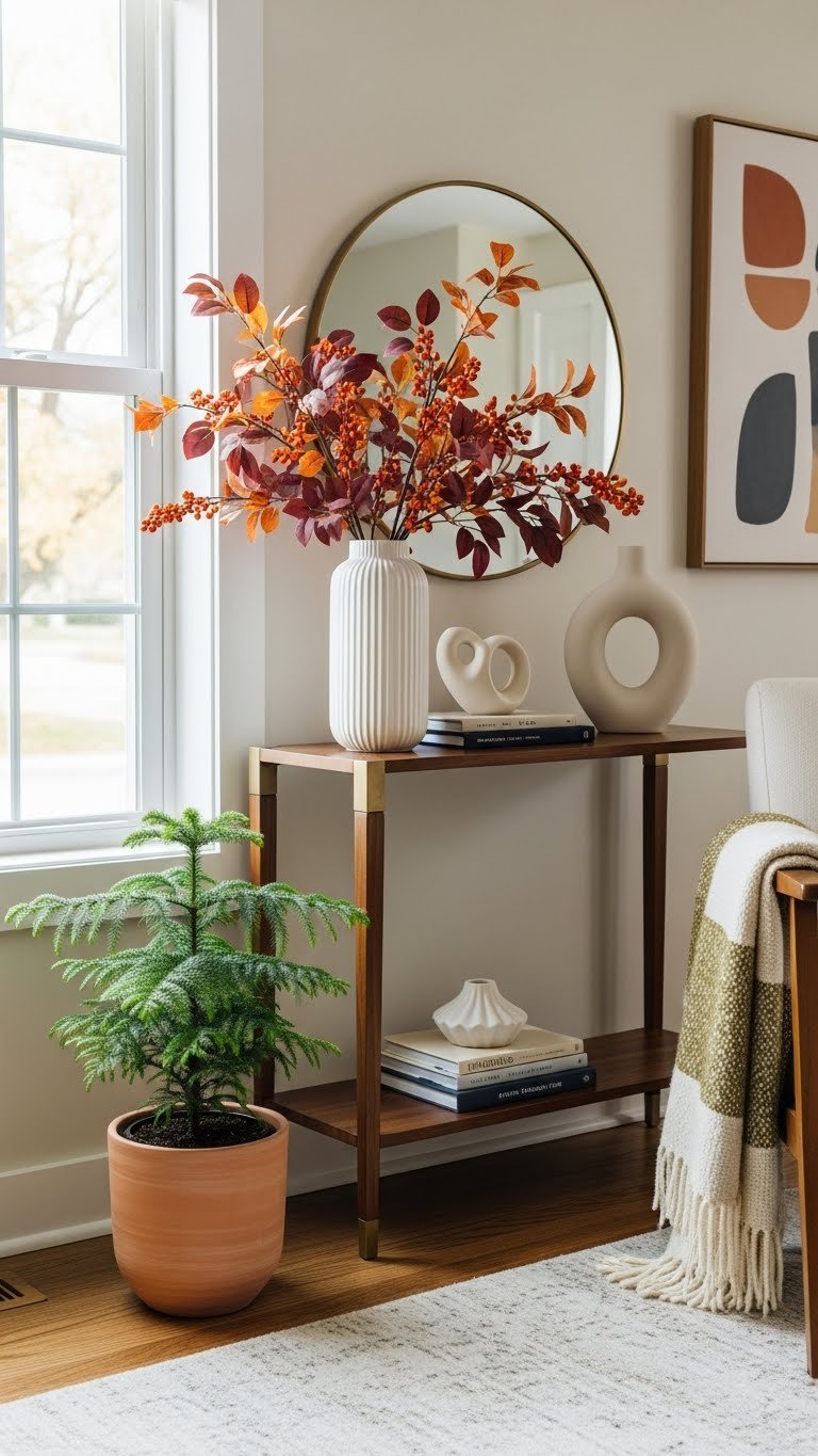 A potted evergreen or a high-quality faux botanical instantly anchors a room with year-round structure and seasonal charm, and you can place one on a console, windowsill, or corner floor to create a predictable focal point.
