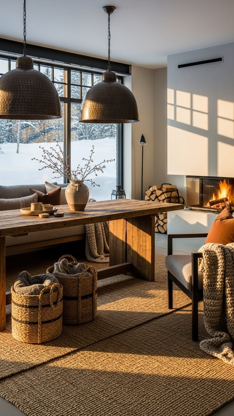 Across a room, mixing warm wood, cool metal, and natural woven fibers gives your winter décor immediate depth and character. You’ll pair reclaimed timber tables with hammered metal lighting, layer sisal rugs under a simple seating group, and tuck straw baskets for throw storage.