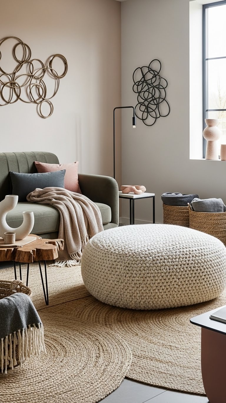 You’ll layer throws confidently, pairing a neutral chunky throw with a cable knit pouf nearby for balance and oversized tassels for movement. Keep colors muted, shapes relaxed, and your space effortlessly liberated.