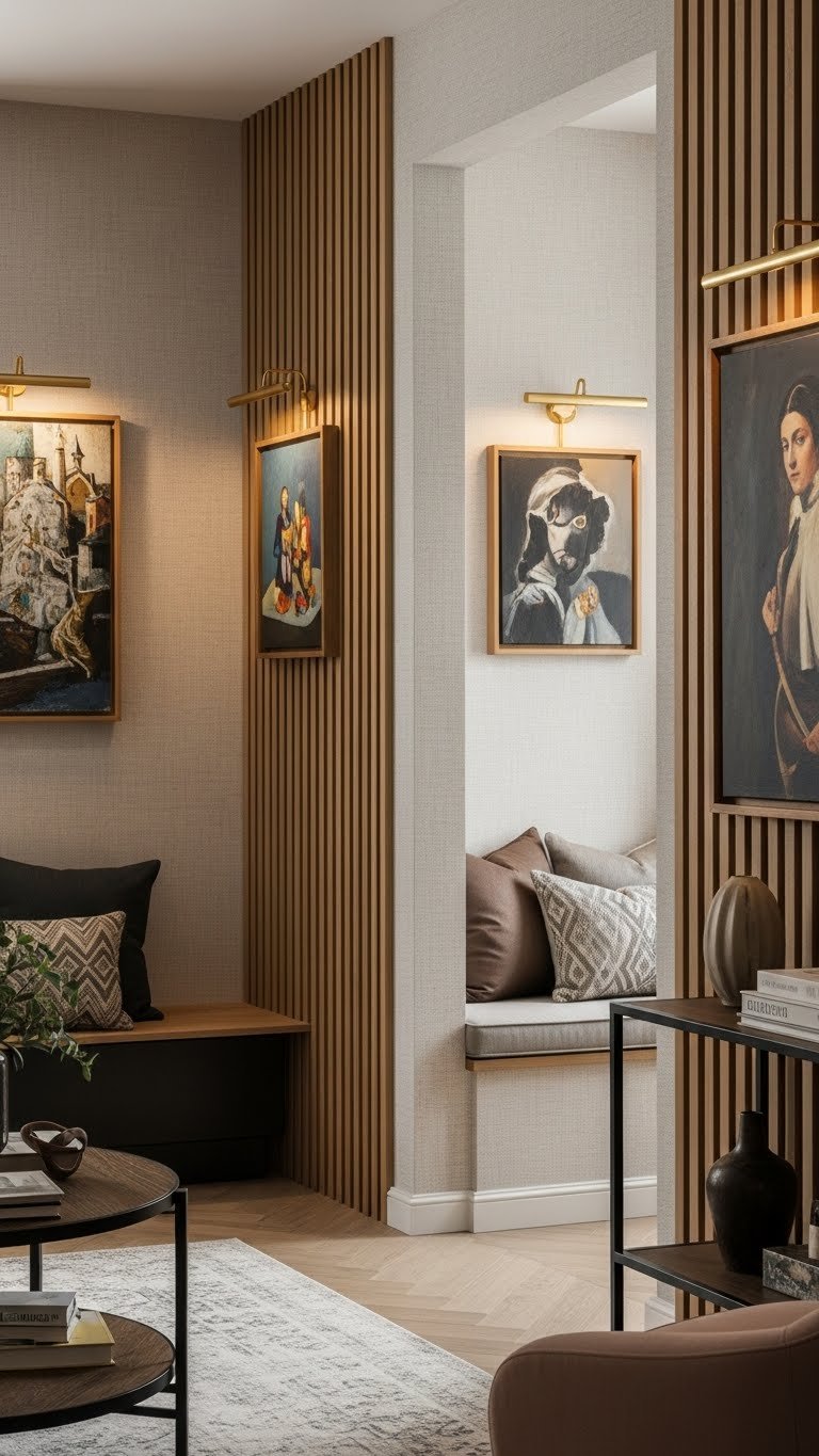 You’ll layer walnut accents alongside soft textiles and matte neutrals, letting warm woodwork serve as a quiet anchor. Choose purposeful pieces that free your space, balancing function with relaxed, refined presence.