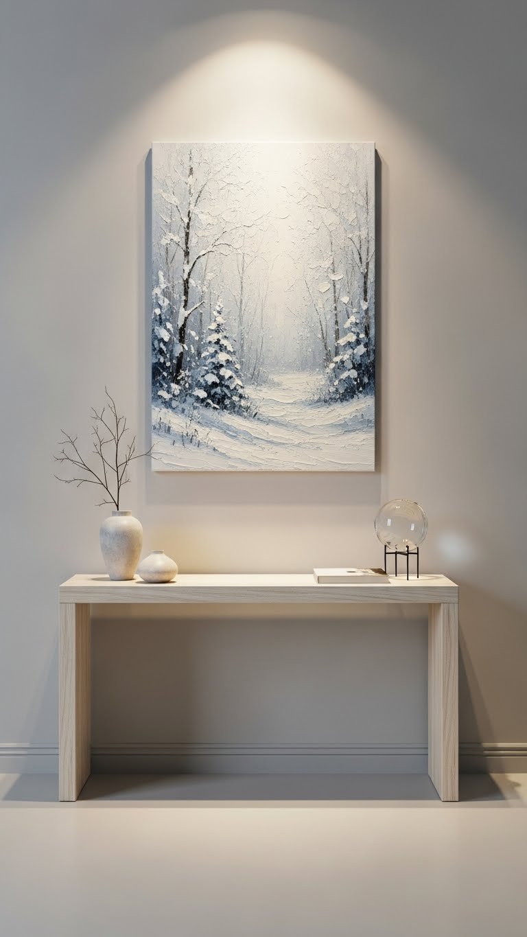 When you hang a snowy landscape canvas, it instantly grounds the room with quiet, wintry calm; the soft whites and muted blues draw the eye and set a serene focal point without overwhelming other décor.