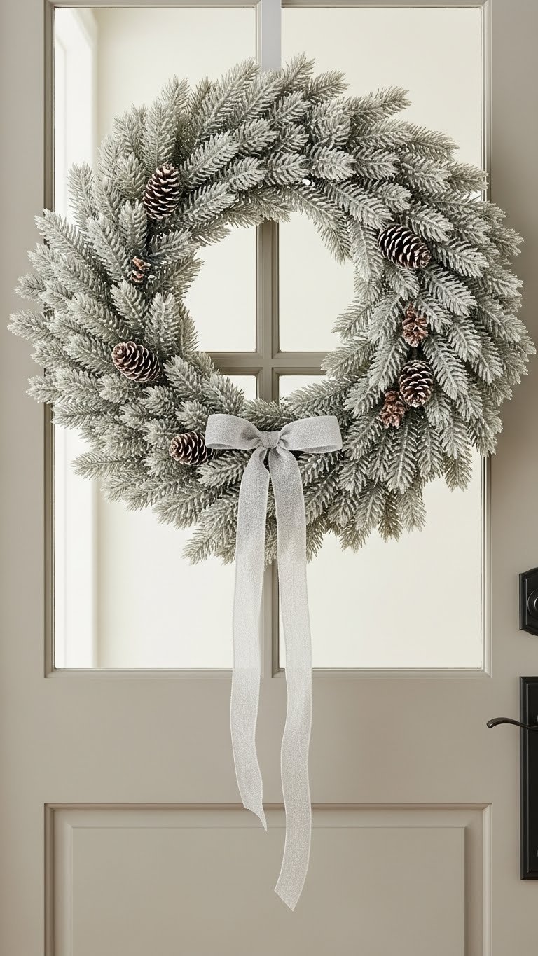If you liked the calm of a neutral quote print, bring that same quiet elegance to your entry with a flocked evergreen wreath accented in soft frost.