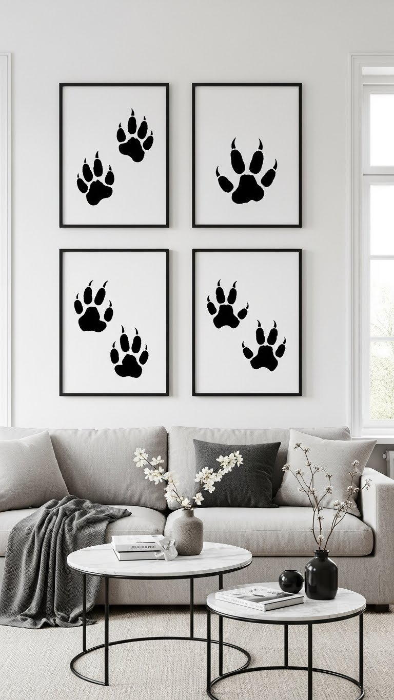 You’ll pick stark black silhouetted tracks on white paper or vice versa, framed cleanly to emphasize form. Monochrome pawprints feel fresh, minimal and free, letting negative space breathe while nodding to nature without cluttering your sanctuary.