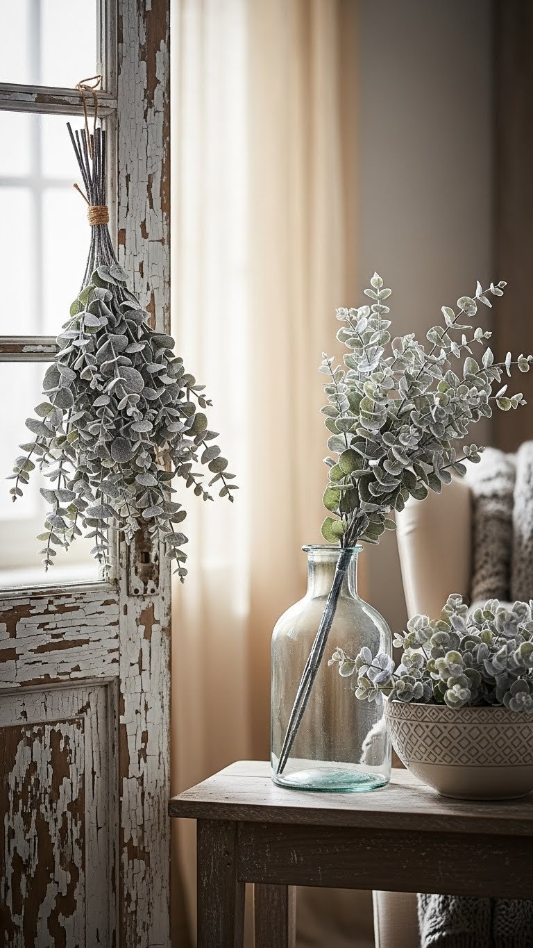 Frost-kissed eucalyptus bundles tied with simple twine bring an easy, natural elegance to winter decor — you can hang them on a door, lean them in a vase, or nestle them in a bowl. Use dried eucalyptus for longevity, trim stems to suit your space, and secure with understated twine bows.