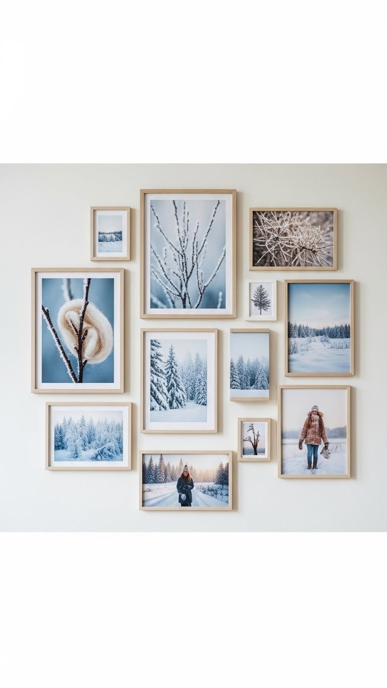 Curate a cozy gallery wall of small winter photographs to give your space a quiet, cohesive personality—mix close-up textures like frosted branches and wool, wide snowscapes, and candid moments of winter light. Choose intimate prints in simple frames, keep a cohesive palette of muted blues, warm taupes, and soft whites, and arrange freely so each piece breathes while the whole feels intentional.