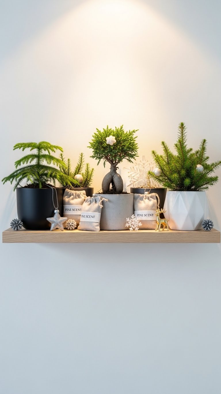 You’ll place miniature evergreens in varied pots along a narrow ledge, add a few scaled ornaments for sparkle, and tuck pine scented sachets between pieces.