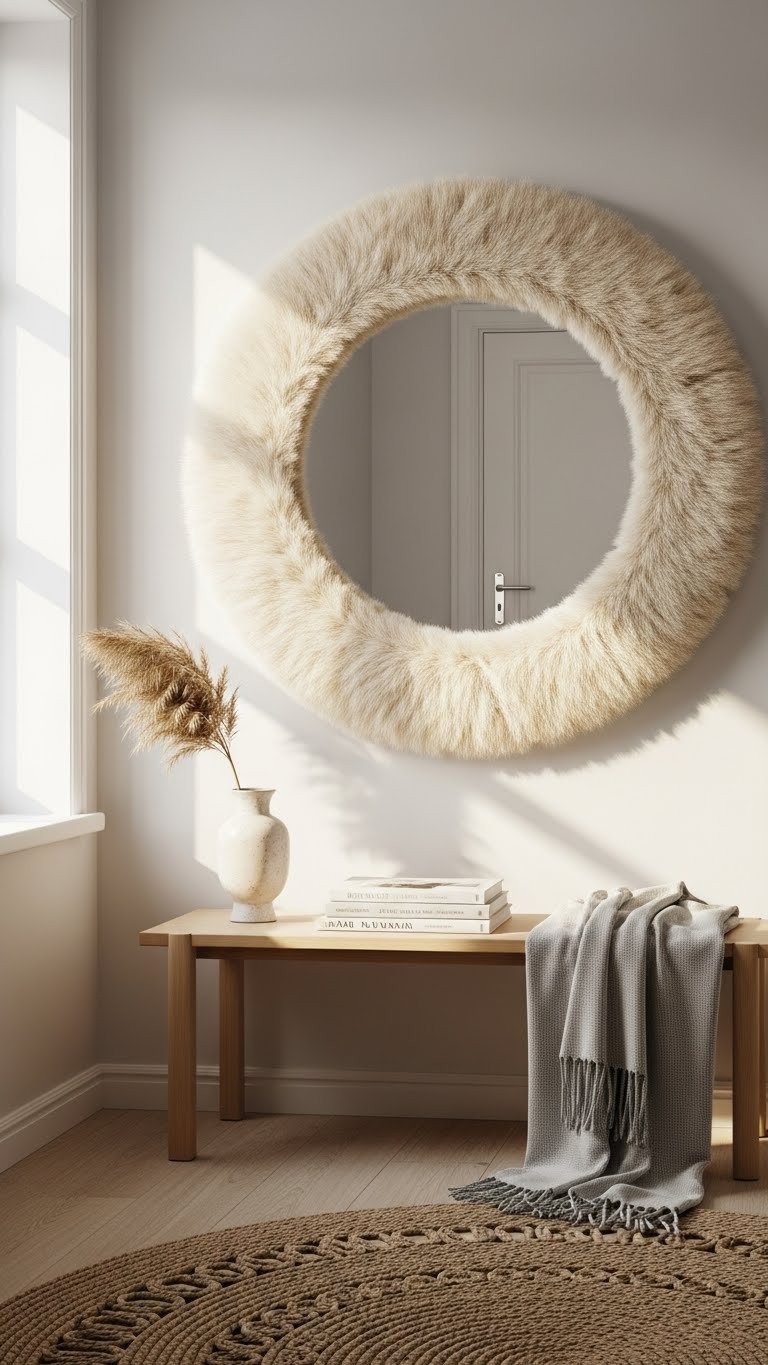 Cozy up your entryway or bedroom with a faux fur framed mirror that softens light and invites touch. You’ll add texture without clutter, choosing a neutral faux fur frame that complements minimalist walls.
