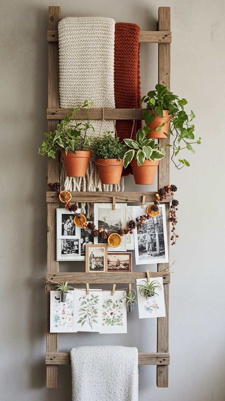Mount a reclaimed wooden ladder horizontally to create an instant rustic shelf that’s both decorative and functional—you’ll gain tiers for blankets, greenery, or seasonal garlands without crowding the room.