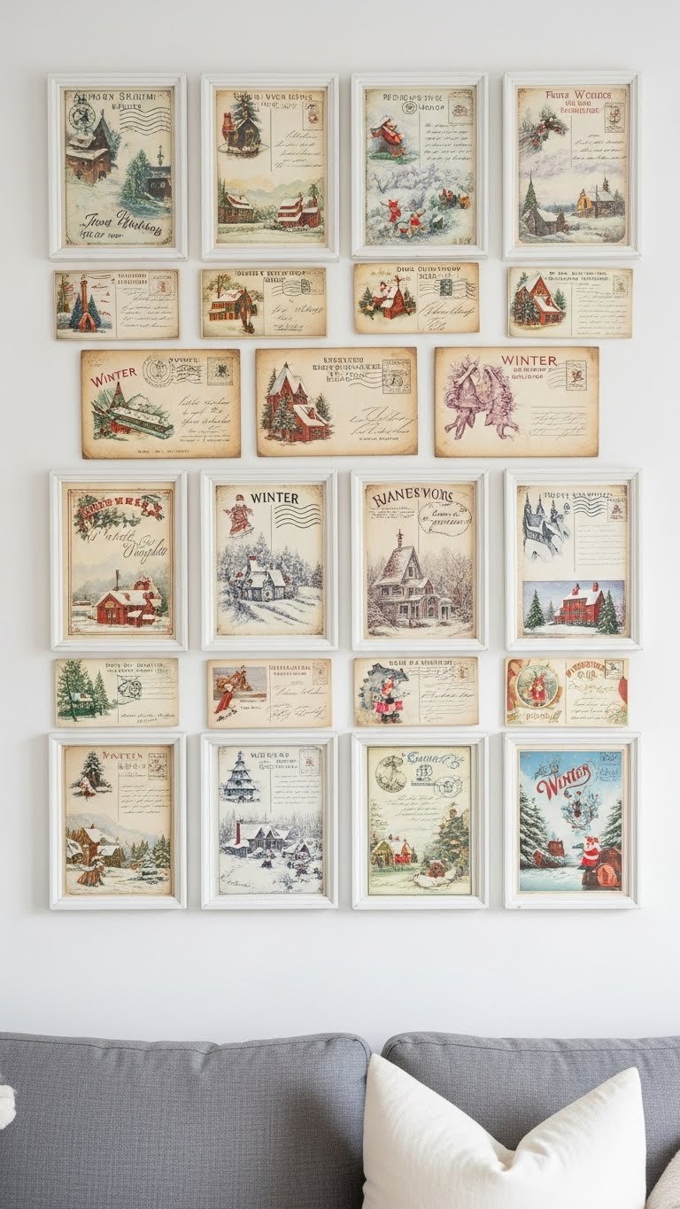 Pull together a tidy grid of vintage winter postcards to give your wall a nostalgic, cohesive look that’s equal parts storybook charm and graphic pattern. You’ll arrange antique postal images and faded seasonal typography in uniform frames, creating rhythm and calm. Mix postcard sizes sparingly, keep even spacing, and hang at eye level so the collection feels freeing, intentional, and effortlessly warm.